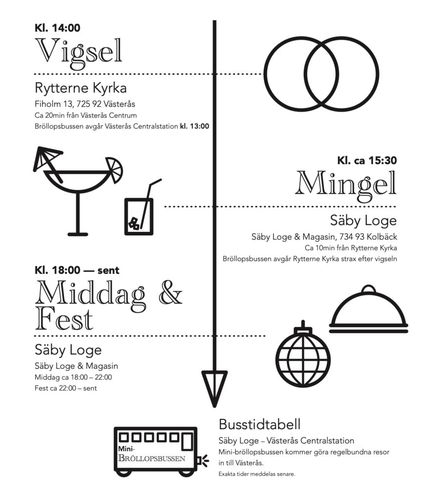 Vi vill göra en helg av detta bröllop och därför har vi planerat aktiviteter runt bröllopsdagen. Vi bjuder på allt under bröllopsdagen, inklusive fria resor med Bröllopsbussen! Fredagen och söndagen får man stå för själv, om man önskar delta.